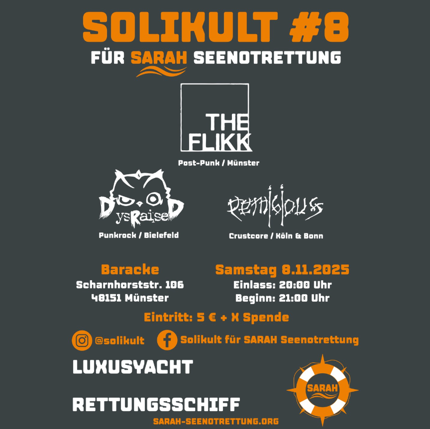 #TheFlikk#DysRaised#Pernicious#Postpunk#Crustpunk#Crustcore#Punk#Punkrock#Baracke#Solikult#SolikultfürSARAHSeenotrettung#SARAHSeenotrettung#RefugeesWelcome#Solidarität#LeaveNoOneBehind