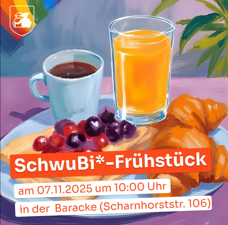 Liebe Queers! Am Freitag den 07.11.2025 veranstaltet das SchwuBi*-Referat vom AStA ein großes Frühstück und lädt euch herzlich dazu ein.
